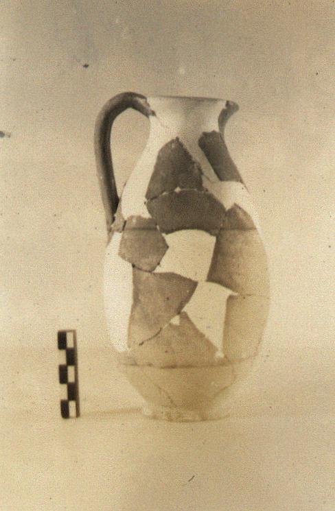 | Description: | Restored in plaster. Similar to P 8842 ff. Flaring projecting base. Purplish clay with white grits; creamy slip; two glaze bands around body; one low down, the other at lower handle attachment. Incised on neck: <graphic> ADDENDA P 8842: Flat bottom. Elongated ovoid body, convex-concave contiguous with neck; flaring mouth. Handle, lip to point of greatest circumference. | |