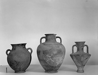 | Description: | Neck, body and handle fragments missing; restored in plaster. Top-shaped body on truncated conical foot. Lower body flaring outward but straight in profile, meeting slightly convex, nearly flat shoulder at a sharp angle. High,flaring, slightly concave neck. Handles shoulder to below rim. Fine moulding around neck between handle and lip. Purplish clay with white grits. Creamy slip. Unglazed. Cf. Olynthos example: AJA (1935), p. 241, fig. 42. Cf. Hesperia Suppl. 5 (1941), p. 140. | |