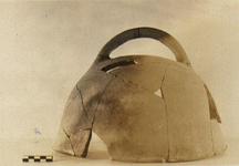 | Description: | Much of one side, many body fragments missing. Restored in plaster. Large domed cover, elliptical at the rim, shaped like a cowbell; basket handle on the top, running with the major axis of the pot. Rim very slightly rolled outward. Coarse red cooking-pot clay with white grits, gray in places; much burned insided. Handmade. Cf. Agora XII, no. 2021. | |