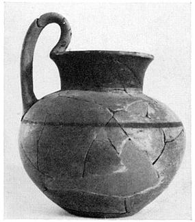 | Description: | Fragments of rim and body missing; restored in plaster. Similar to P 8865 (Γ 2302) in shape, fabric, and decoration, but slightly smaller and squatter and flat-bottomed. Reddish-brown glaze bands somewhat peeled. ADDENDA P 8865: Similar in shape, decoration and fabric to P 8864 (Γ 2301), but smaller and with strap handle, concave in section on its outer face. P 8864: Round-bodied, round-mouthed jug on flaring ring foot; short concave neck. Handle looped high, from shoulder to rim. Fine pinkish buff clay; black glaze on outside of foot, inside and outside of neck and a band at point of greatest circumference. | |