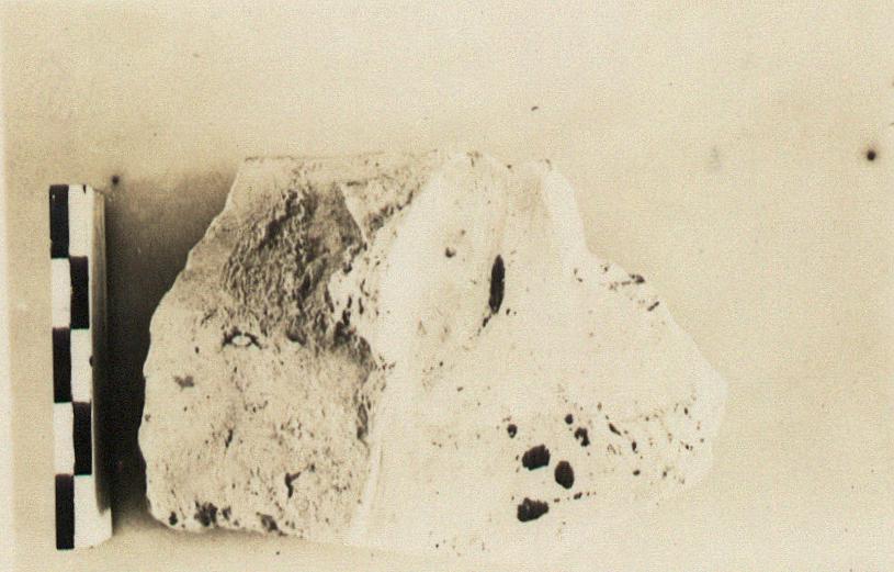 | Description: | Fragment from wall of large heavy vase. Preserved is the forepart of a ship, to left, probably from under the handle, part of the attachment for which is preserved at the left. Buff clay; black glaze for the design, mostly disappeared. | |