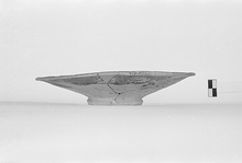 Description:   Fragments missing from rim and floor. Plate with ring foot and plain rim, slightly downturned. Irregular grooved circles around the center.