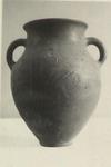 | Description: | Most of one side and base preserved, mended from many fragments; the other side, the neck and one handle restored in plaster. Reddish-brown micaceous clay. Household jar. | |
