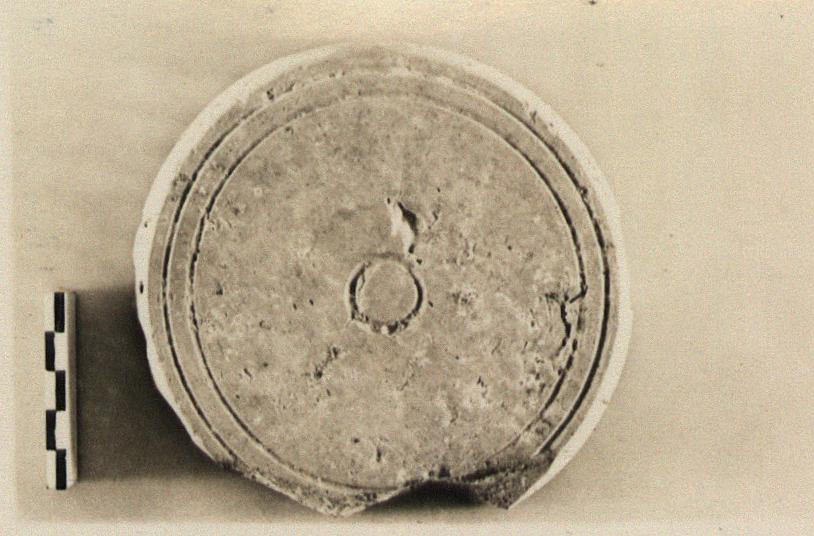 | Description: | A circular plain plaque, with grooves on top surface: two near the edge; a small one at the center. Red-brown clay; top surface and edges polished; bottom left rough. Pot stand? | |