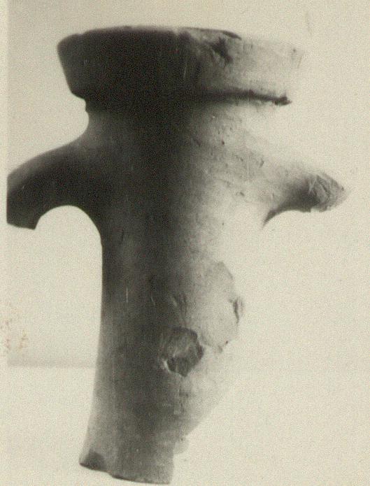 | Description: | Neck preserved nearly complete; handles broken away below curve. Stamp on outside of heavy rim [H. (letter) 0.022m.]: <graphic> Coarse red clay. Lighter at surface. | |