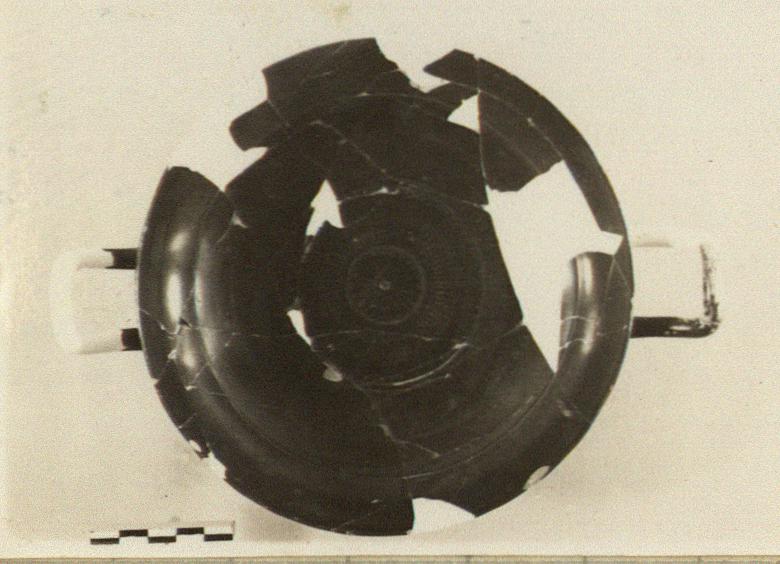 | Description: | Mended from many pieces. Complete save small fragments of rim and body and parts of both handles. A stemless cup with low moulded ring foot. Offset lip on interior but not on exterior. Stamped pattern covers most of floor of cup: three concentric rings of long tongues. Beneath foot concentric raised rings. Small central circle reserved with dot and two black rings in thin glaze. Glaze, fine lustrous black, worn off on one side. | |