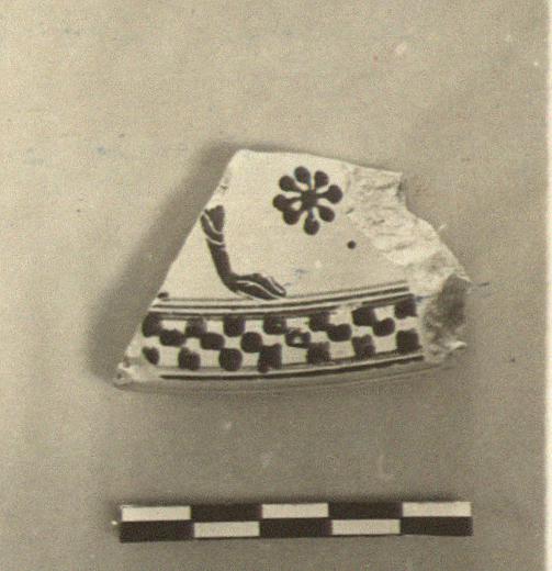 | Description: | Fragment from the edge of a lid. Two legs of an animal, a dot rosette, and, at the edge, a checker pattern. Inside smooth and unglazed. Protocorinthian. | |