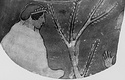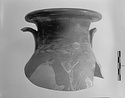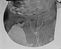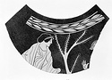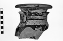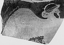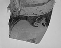 | Description: | A single fragment (with one small joining piece) preserves the upper part of the base and the stubs of the handles. A) Boreas, wing outspread behind him, bearded wearing wreath and sleeveless chiton, reaches forward with both arms. B) At left a female figure right, center a tree, right the top of the head of a figure left, apparently looking down, with hand in gesture of surprise(?). Black lines for inner details mostly rubbed off, leaving white marks. Red for Boreas' wreath, and the wreath of the right hand figure and the leaves of the tree on B). Broad reserved band just outside mouth. | |