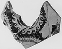 | Description: | Three joining fragments preserve about three-fourths of base ring and part of floor of plate with central depression. Around central depression wave pattern, then parts of two fish. | |