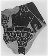 | Description: | Broken all around. Fragment of large closed pot. Upper legs of nude male figure striding left (Herakles - part of lion skin hangs down between legs?) at left the scaled body of the Hydra(?). A red dot in each scale. | |
