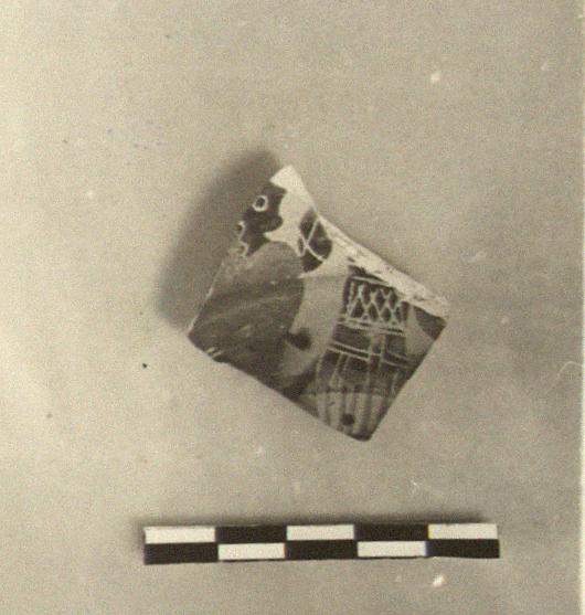 | Description: | Broken all around. Fragment of small lekanis(?). Exterior: part of a siren, right, facing a lotus flower; between, a blob rosette with incised cross. To right of lotus, part of breast of another siren. Below, rays. Red for sirens' bodies and on alternate petals of lotus. Interior black glazed, with broad red band. | |
