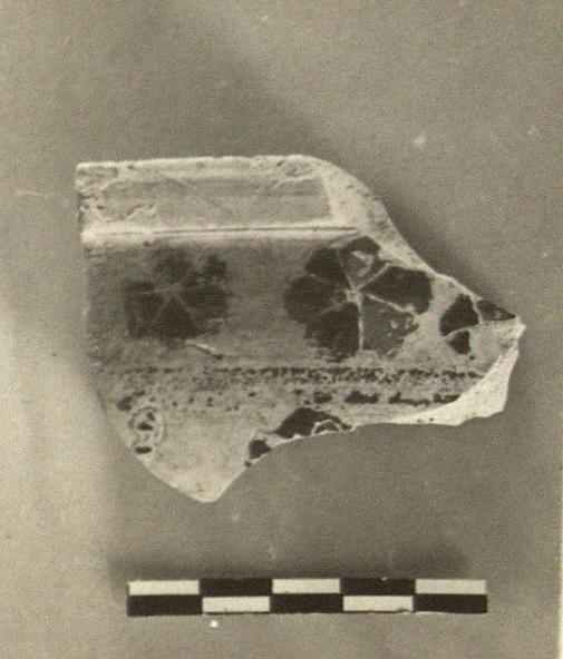 | Description: | Fragment from rim of open bowl. Above, rosette, the petals alternately red and black. Below, part of an animal frieze; a raised paw, and the head of a lion, left, turned back. The rim is flat-topped and has a marked overhang on exterior. Black glaze on interior and on top of rim. Red lines on top of rim, two very close together near outer edge; one, possibly more, near inner edge. Pale clay. | |