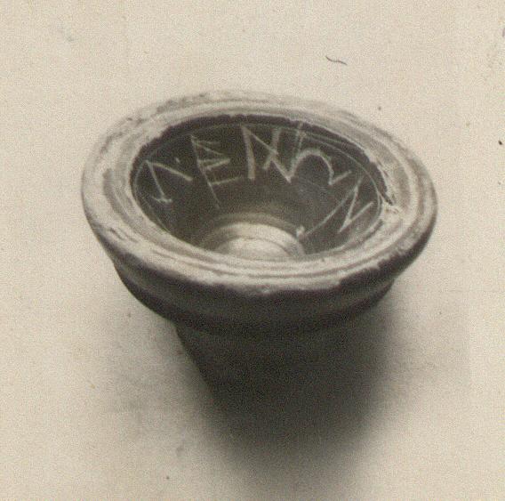 | Description: | Moulded base only preserved. On outside and undersurface, scraped bands colored with miltos. Inscribed on concave undersurface: <graphic> Good black glaze, inside and out. | |