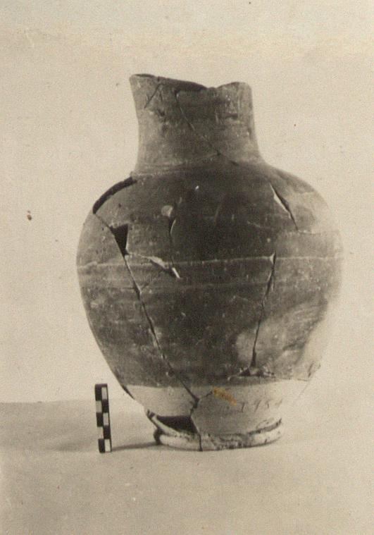 | Description: | Fragments of trefoil lip seem to belong but do not join. Handle and fragments of walls missing. Low heavy foot ring; ovoid body. Coarse buff clay; dull glaze paint, red to black outside to a little above foot, and on inside of neck. | |
