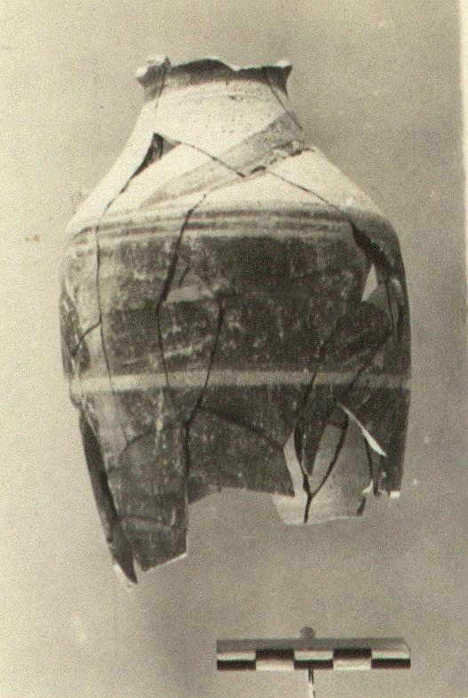 | Description: | Bottom, mouth and band handle missing. The mouth was probably round. Glaze to handle zone, with one reserved band half way up and three just below handle attachment. Glaze bands around neck and mouth, which was probably round. Vertical bands on handle. Wide curved band on front of shoulder. Clay purplish-gray with many white grits. Thin glaze, black to brownish. Certainly not Attic. | |