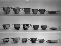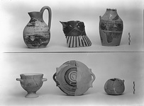 Description:   Half preserved, with one handle with turned out ends at rim. Restored in plaster. Interior glazed with two reserved bands. Stroke series on reserved upper face of rim. Outside covered with fine bands, except two wide bands around bottom and wavy line around rim. Glaze rings on bottom.