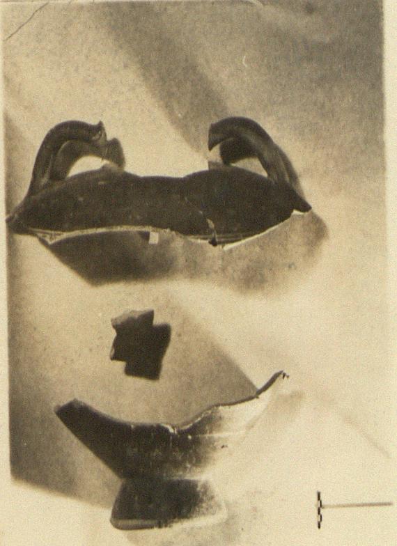 | Description: | a) Handles and shoulder of a large bloated amphora with rolled handles and a series of reserved bands just below the shoulder. b) Part of lower body with high flaring ring foot of the same or a very similar amphora. c) Small non-joining fragment from wall. Pink clay. Red to blackish glaze. | |