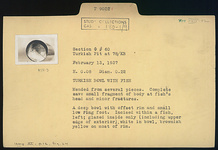 | Description: | Mended form several pieces; complete save small fragment of body at fish's head and minor fractures. A deep bowl with offset rim and small low ring foot. Incised within, a fish, left. Glazed inside only (including upper edge of exterior), white in bowl, brownish-yellow on most of rim. | |
