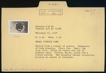 | Description: | Mended from a number of pieces; fragments of body missing. Plain rim; small low ring foot. Glaze on inside and top of outside only. Colors: white, green and a little yellow. Two slightly raised concentric circles at center of interior. | |