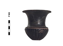 | Description: | Mended from many fragments; about one-third of rim missing. Shaped like a calyx krater without foot or handles(?). Deep flaring rim. The lower part ornamented with fluting; the rim with an ivy pattern in clay-colored paint. Cf. CVA Pays Bas, 2, III L, pl. 4,2. | |