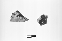 | Description: | Two fragments from a cup with rim offset inside. a) A bit of the rim with a reserved band. The head and shoulders of a woman looking left (moving right?). She wears a chiton and over it an himation falling straight over both shoulders. Her hair is bound with an eleborately folded saccos from which her curls escape at the back. The iris of the eye a dotted circle. A single line of brown on the right hand of the figure. To the right is part of the long hair and the drapery(?) of another figure. b) A bit of a raised right arm with full sleeve falling away from the elbow. Some relief contours on both fragments. Excellent glaze. | |