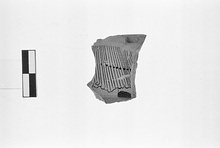 | Description: | Fragment from wall of a large open pot. Lower part of the chiton and feet of a female figure to left. A purple band below. Pinkish-buff clay, good black glaze. Relief contour. | |