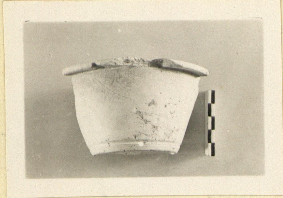 | Description: | Bowl with very low ring foot, flat floor, steep walls, and outcurved rim. Groove around lower body above foot. Stamp (half preserved) at center of floor: <graphic> Graffito on bottom, alpha. Micaceous pink clay. Red to cream glaze. Samian A Ware. ADDENDA The stamp, more likely a simple asterisk [JWH]. Cf. Agora XXXIV, p. 182. | |