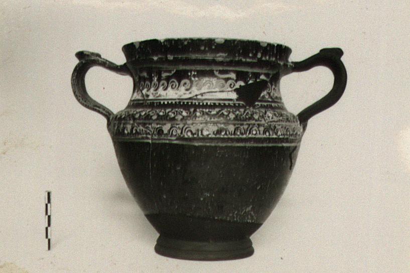 | Description: | The base, one handle and fragments from the wall missing; restored in plaster. Narrow shoulder; short neck with a projecting ridge at the line of handle attachment, below the lip. Applied leaf on high point of broad band handle; just below shoulder, narrow band of egg and dart between two miltos grooves. Decoration in white and clay-color: on shoulder, an ivy pattern; on neck, waves, dolphins and rosettes. Groove below ridge. Ivy pattern on handles. Glaze somewhat chipped. | |