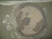 | Description: | Mended from many fragments and largely restored in plaster. Large flat plate; bottom rises slightly in center; curving rim, narrow flat lip. Circles incised around center inside, in five groups of two each. Brown micaceous clay. Painted red inside; paint heavy, but dull and poor. ADDENDA Pompeian Red Ware [JWH]. | |