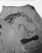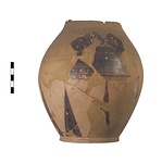 | Description: | Fragmentary; the body largely restored in plaster; no remains of neck or handle. The low ring base is decorated with two narrow bands of reddish-brown paint; above this base, the broad rays rise for nearly half the height of the pot; two narrow stripes divide them from the shoulder panel: solid black in back, in front a large head of a lion, drawn in outline, the mane and a single projecting paw solid. Pinkish clay. Paint lustrous black to brown. ADDENDA A few small fragments added from B sherds [Summer 1935]. | |