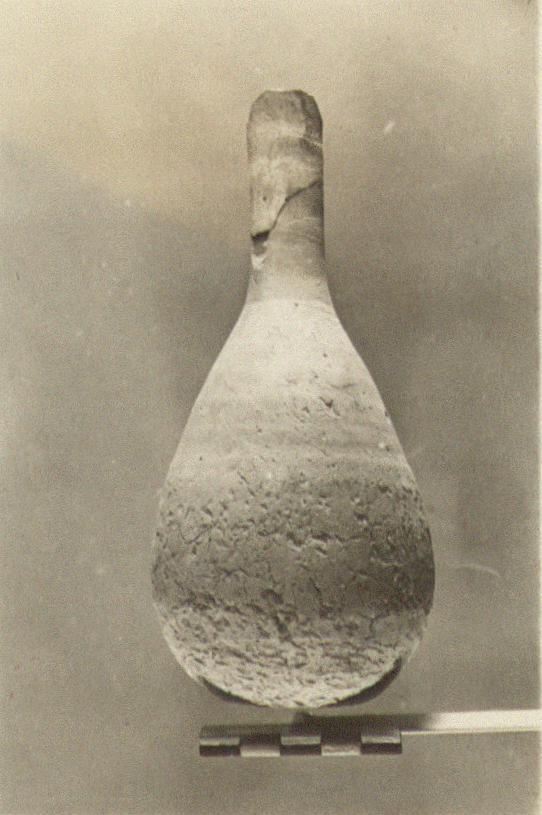 | Description: | Mouth broken off. Long neck and drop-shaped body flattened at the bottom. Flaky pink clay. | |