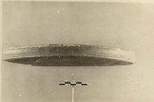 | Description: | Part of rim and floor. Vertical rim, concave in section, with a groove near its upper and lower edges, and rouletting on the edges. Buff clay, red glaze. Western Sigillata. | |