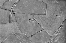 | Description: | The vertical rim is broken off. Restored in plaster. Low ring foot; the outer part of the floor offset and raised above the center. Decorated inside and out with single and double grooves. Plantaform stamp at center of floor (incomplete): <graphic> Samian B. | |
