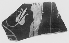 | Description: | Fragment from lower wall. Legs of a youth (from waist to ankle) facing right. His right hand is on his hip. In front of him a staff, and at right trace of some other object. At left, a bud, and part of handle decoration. Pinkish-buff clay; good black glaze; inside, a pair of narrow bands reserved, and a bit of a third. No relief contours. Small scale, rather fussy work, recalling the P 70 series. | |