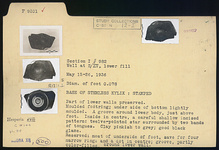 | Description: | Base and part of lower walls preserved. Moulded foot ring; underside of bottom lightly moulded. A groove around lower body, just above foot. Inside in center, a careful shallow incised pattern: twelve-pointed star surrounded by two bands of tongues. Reserved: most of underside of foot, save for four narrow rings and a dot in center; groove, partly color-filled around lower wall. Clay pinkish to gray; good black glaze. | |