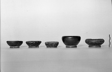 Description:   Broad low base, very slightly concave below. Heavy low sides, slightly drawn in at top to plain lip. Reserved: underside of base.