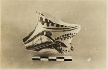 Description:   Broken all around. Fragment from upper part of panel of a kalpis [originally identified as oinochoe(?)]. Black glaze at top of interior.