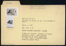 | Description: | Broken all around. Forepart of horse, galloping right; head missing; incised leg of rider preserved. At right, tail of another horse. Interior glazed black. | |
