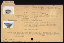 | Description: | Under surface rough, unfinished from the wheel; curving body; broad projecting rim, nearly flat; wide vertical band handles, carelessly attached. Pink clay; no glaze. Miniature Votive Bowl. Six complete bowls like this and fragments of about 200 more were found in this cistern. | |