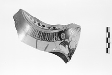 | Description: | Two fragments preserving part of the shoulder and lip of a pseudo-Panathenaic amphora. Echinus lip. On neck, lotus and palmette. Tongue pattern bordering upper edge of panel; in panel, Athena left, in full panoply. Added white and red. Mended in antiquity; one hole for a lead clamp remains. ADDENDA To the left of Athena, a votary holding springs (only parts of the springs remain) [JDB, Summer 1953]. | |