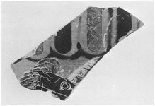 | Description: | Broken all around. Fragment of a large open pot (interior dull black glaze). Above, tongues alternately red and black. Below, parts of the heads of two horses. Mane of left horse red; of right, white. | |