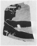 | Description: | Broken all around. Black glaze inside; lid(?). Part of the head of a youth right, arms outstretched. White fillet with red leaves. | |