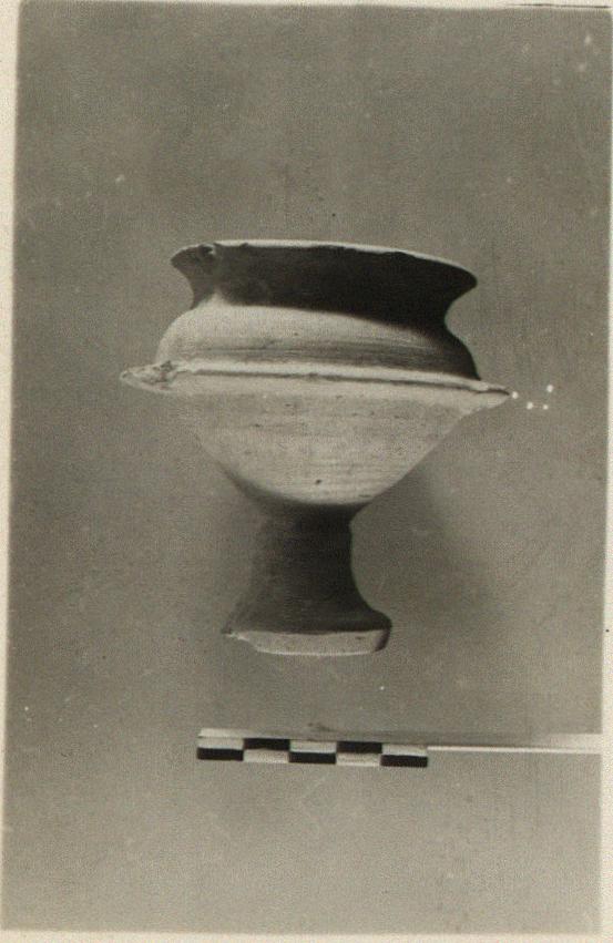 | Description: | Handles, fragments of lip, flange, and base missing. Otherwise intact. Flange pierced with two holes on each side. No traces of white left. | |