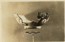 | Description: | Mended from a number of pieces. Complete circle of base, lower part of body, and part of rim preserved. Kiln-tripod marks inside. On interior, cream glaze. Exterior, designs in green and yellow. | |