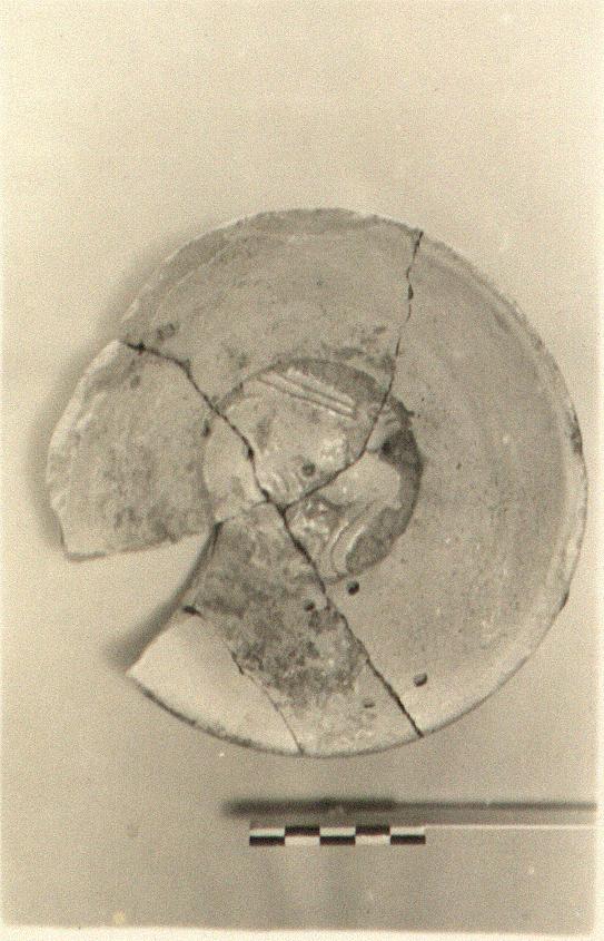 | Description: | A flaring stemmed bowl, the stem completely broken away. In the center, a medallion with a rabbit against an incised background. Crude work. Reddish clay, yellow glaze; white slip covers the outside. Mended in antiquity. | |