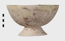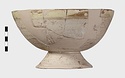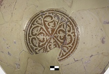 | Description: | A deep bowl on a high conical base. Restored in plaster. In the center, a medallion, with a quatrefoil palmette ornament against an incised background. Reddish clay, yellow glaze. The entire outside covered with a white slip and thin colorless glaze. | |