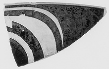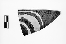 | Description: | Fragment of rim of eye cup, preserving part of a large eye. Near top, to right of eye, two letters in added red, partly rubbed off: Κ Α (Λ Ο Σ). Reserved band at lip, inside and out. Outline in part at least incised. | |