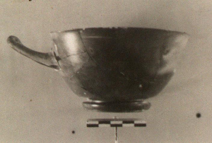 Description:   Parts of rim and wall and one handle missing. Moulded base ring, sharply concave above and set off from wall by a reserved line; inside, reserved, lightly moulded, decorated beneath with glazed circles and dot. Lip slightly out-turned at edge, offset on inside only.