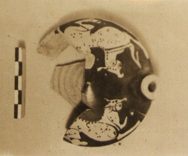 | Description: | Beginning of spout and part of top preserved. Shallow type. A crouching spotted feline on each side, facing the spout. Reserved ground line where top and walls join. | |