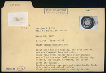 | Description: | About half the rim and both handles missing; one rim fragment does not join. Restored in plaster. Heavy ring foot; nearly flat floor sharply set off at its edge from straight flaring lip; outside, lip slightly concave and offset above the handles. Black glaze rather smeary; running to red. Resting surface reserved; space inside foot also reserved, with circle and dot at center. | |